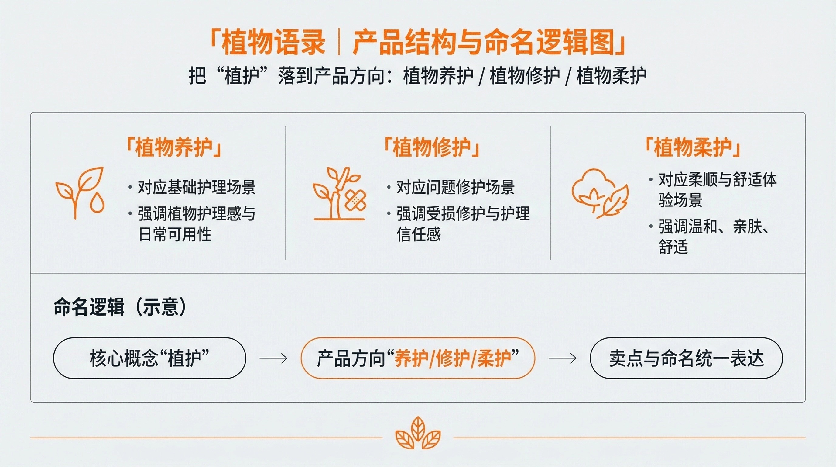 产品结构:构建「植物养护 / 植物修护 / 植物柔护」三大产品方向,并沉淀卖点与命名逻辑。