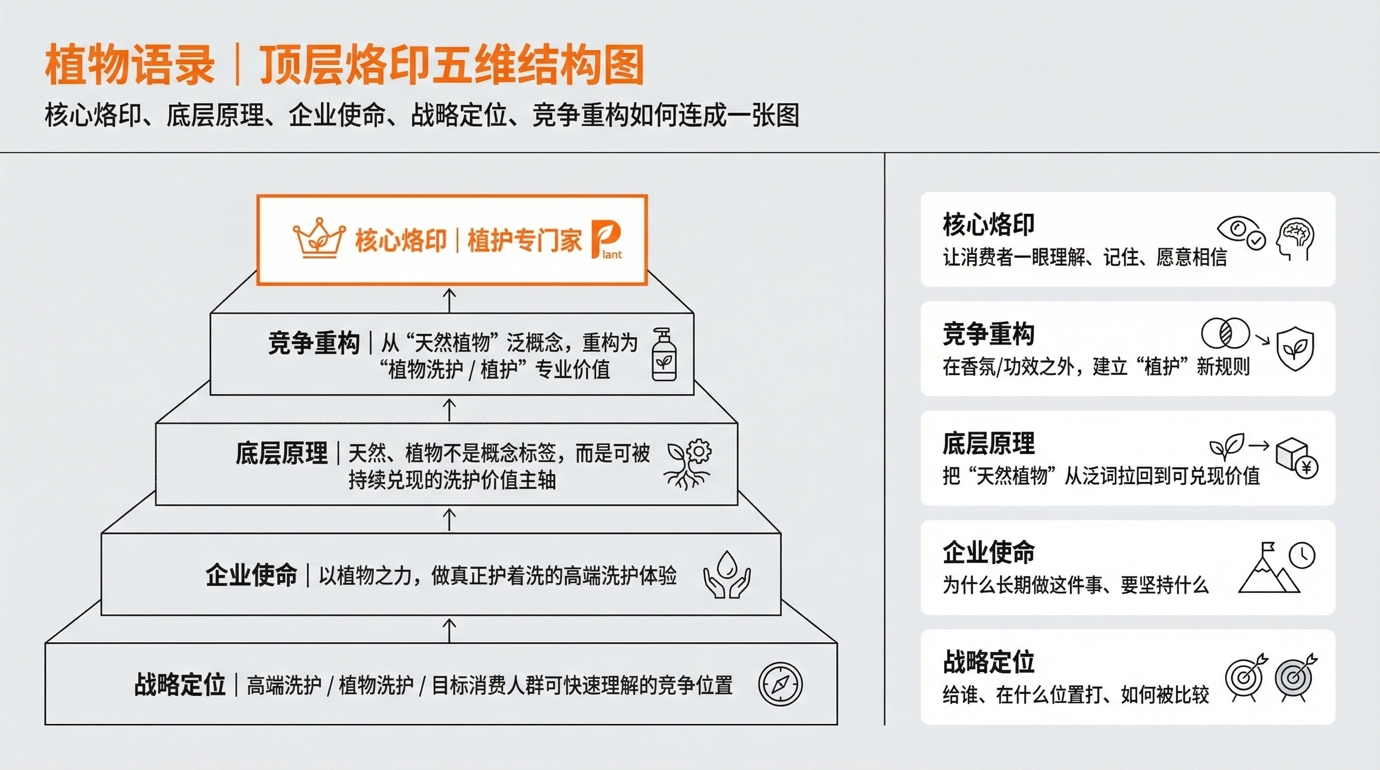 最后搭建烙印体系与触点表达:确立极致烙印「植护专门家」,并围绕“由洗到护,到真正的护着洗”建立语言、产品与视觉的一致性表达。这相当于把顶层烙印五维压成可执行的一页框架:核心烙印明确、竞争重构清晰、触点落地可检查。