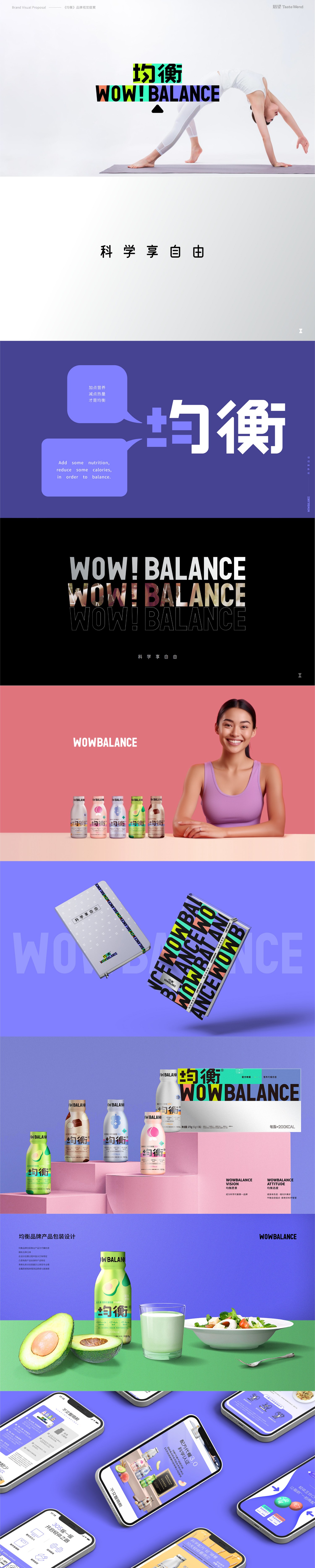 第三步:把视觉烙印从‘科学正确’推到‘一眼记住’:均衡项目里最能看出成果变化的,就是视觉系统的消费化重构。品牌没有停留在传统保健营养品常见的冷白蓝路线,而是把“均衡”这个词和 WOW!BALANCE 英文烙印结合起来,用大字标、高对比度、强识别块面、‘+’符号、分区色块和大面积留白,做出一套同时具有科学感、活力感和年轻感的视觉语言。你会发现,它不是在装饰品牌,而是在服务记忆:消费者第一眼先看到‘均衡/WOW!BALANCE’,第二眼看到‘配方晚餐/营养代餐奶昔’,第三眼再看到细分利益点与规格信息。这就是视觉烙印该干的事——先识别,再理解,再相信。